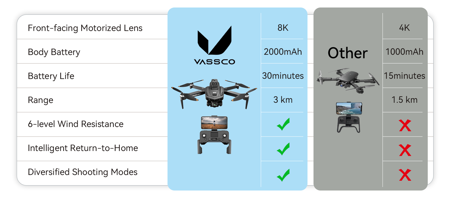 The Vassco GPS Drone was born. Vassco GPS Drone delivers stability and precision like never before. Its intelligent flight system, GPS navigation, and advanced obstacle avoidance keep it steady in any environment, while the 8K dual-camera setup with AI enhancement ensures every shot is crisp, vibrant, and cinematic.