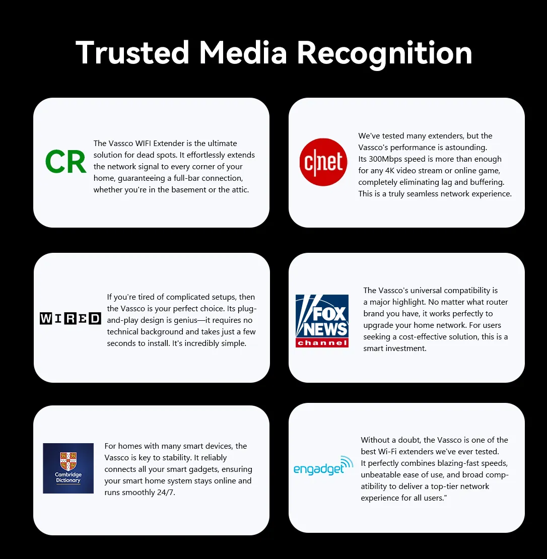 Tired of your family fighting over bandwidth? When one person is watching a 4K movie in the living room, others playing games or video calling experience lag, which often leads to frustration and arguments.The Vassco extender puts an end to all those network worries by providing Smooth Wi-Fi for the Whole Family. It ensures every device gets a stable, high-speed connection, so your smart TV, gaming console, or phone can all run smoothly at the same time. Say goodbye to buffering and lag, and bring true harmony to your home network.